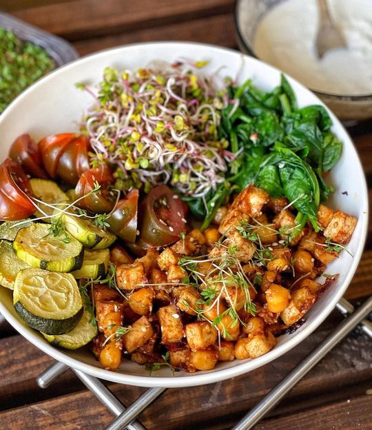 • Neviem čím to je ale asi tou prichádzajúcou jarou 😄že viac a viac mi zas idu po chuti take jedla viac zeleninové, také viac živé bez mäsa aj keď ja tomu mäsu fakt neublížim😅 varím ho väčšinou v nedeľu keďže u nás to bolo zaužívané vždy ako take sviatočné jedlo teda stále aj je. No a teraz som našla doma skoro rok po záruke tofu mesiac mu chýbal asi😆 ale na moje prekvapenie nič mu nebolo. Ani som sa nepo💩😂 celé som to zjedla a bolo to výborne dokopy s cicerom. Super nápad keď máš v chladničke suroviny ktoré musíš rýchlo spotrebovať. 1 biele tofu Polovica pohára cicer poké omáčka sezamova z @aktinsk cuketa 1-2 hrste špenát čerstvý granulovany cesnak sušená cibuľa hym.soľ @vilgain mletá rasca čierne korenie mletá červená paprika sezam lúpaný kúsok čedar (kľudne vynechať) reďkovka a žerucha klíčky pásikavé rajčiny Tofu nakrájať na kocky hodiť do misky s prepláchnutým cicerom naliať poké omáčku ochutiť soľou, rascou, paprikou, korením, sézamom, všetko dávam podľa chuti odoka. Poriadne premiešať dať na plech s papierom na pečenie nastrúhať na to čedar a piect spolu s nakrájanou cuketou na 200*C 30-35min. Špenát som chvíľu na panvici premiešala tiež s granulovaným cesnakom.👌🏻 K tomu som si dala jednu light mozarellu natrhanú na rezančeky zmiešanú s 2 lyžicami kyslej smotany zriedené trochu mliekom a soľou. #dnesjem #aktin #aktinsk #uzasnejedlo #varimezdrave #varimeslaskou #mojobed #dnesobedujem #dnesobedvam #dnesjim #dnesjemfit #dnesjemfit #dnesjemzdravo #zdraverecepty #zdravejedlo #vkuchyni #tofurecipes #veganskerecepty #veganjedlo #veganfood #dobrejedlo #vilgain