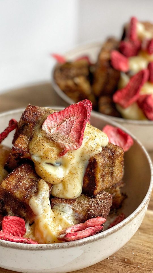 Trojité výborne a s proteinovým pudingom s lyo jahodami😋😍 6 plátkov Vilgain sandwich bread 40 g Vilgain cheat spread čokoláda - škorica Mliečna zmes: 80 ml mlieka 1 vajce 2 čl xylitolu 30 g Grass Fed Whey Proteinu vanilka Navrch: 25 g xylitolu 2 čl cejlonska škorica 1 vanilkový proteínový puding 30 g lyo jahody #dnesjem #aktinrecepty #vilgain #vilgainczsk #dobrejedlo #toastbites #minibites #frenchtoastrecipe #frenchtoastday #francuzskytoast #vkuchyni #foodporn #nebickovpapulke #dobrerano #dobrejedlo #dobrejidlo #aktin #aktinsk #aktincz #dobrerano #dobréráno #dnessnidam #snídaně