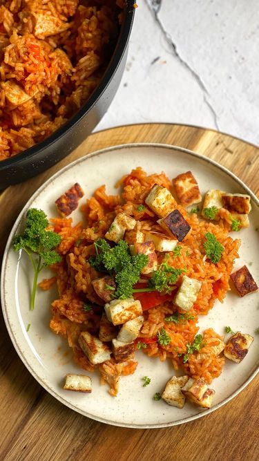 Krémová basmati ryža a výborná kombinácia 👌😋 2 pl olivového oleja 1 cibuľa 2 strúčiky cesnaku 300 g kuracích pŕs 2 lyžice paradajkového pyré podľa potreby aj viac 1/2 čl mletej rasce 1 čl mletej papriky 1 červená paprika 1 Vilgain zeleninový vývar 1 pl kvetového medu 1 čl morskej soli 200 g ryže Basmati 1 syr halloumi Na oleji opečieme nakrájanú cibulu a cesnak. Pridáme nakrájané kuracie mäso, nakrájanú papriku a poopekáme. Ochutíme soľou, korením a mletou paprikou. Pridáme pyré, med a dobre premiešame. Prisypeme basmati ryžu. Zalejeme zeleninovým vývarom. Necháme variť pod pokrievkou, kým mäso nezmäkne (asi 30‑40 minút). Podľa potreby ešte môžeme pridať vodu pre krémovejšiu štruktúru. Halloumi nakrájame na kocky a poopekáme na panvici. Ryžu s mäsom navrstvíme na tanier, na to halloumi, posypeme nasekanou petržlenovou vňaťou. #dnesjem #vkuchyni #dnesjim #dobrejedlo #dnesjimfit #dnesjemfit #uzasnejedlo #dnesvarim #mojobed #dnesobedujem #dnesobedvam #obed #oběd #vkuchyni