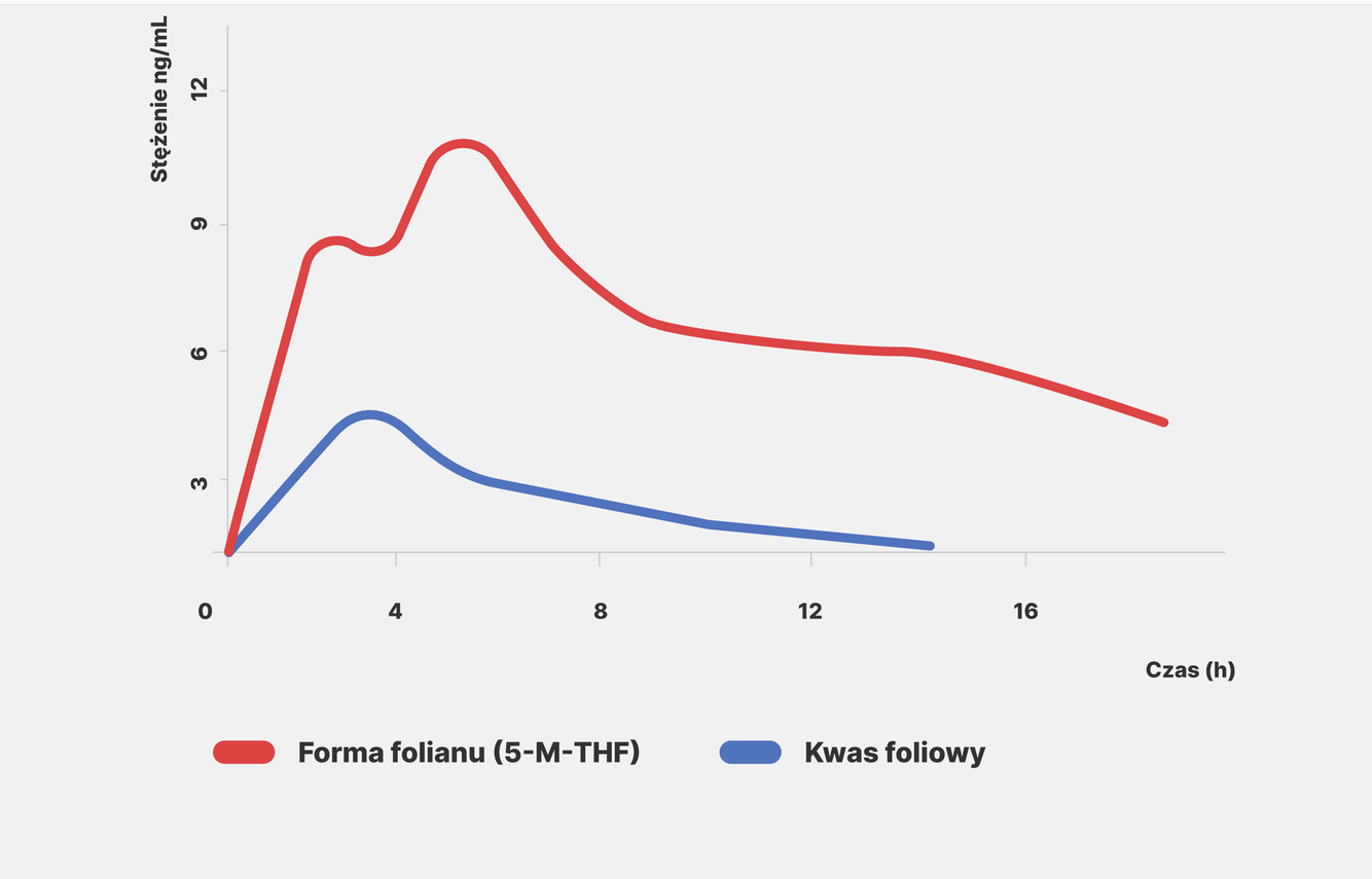 Porównanie wchłaniania kwasu foliowego (FA) i aktywnego folianu (5‑MTHF) we krwi [1]